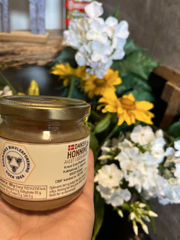 - Honning: Naturlig honning fra vores egne bier, der samler nektar i og omkring vores blomsterhaver.